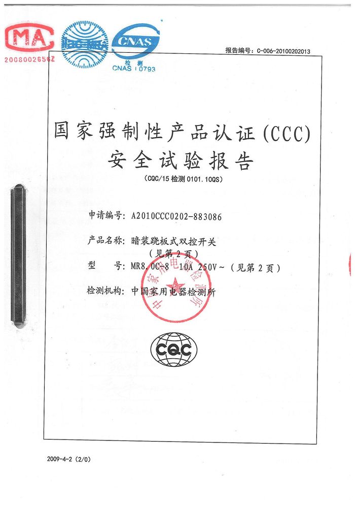 MR8.0C開(kāi)關(guān) 86D插座資質(zhì)證書(shū)