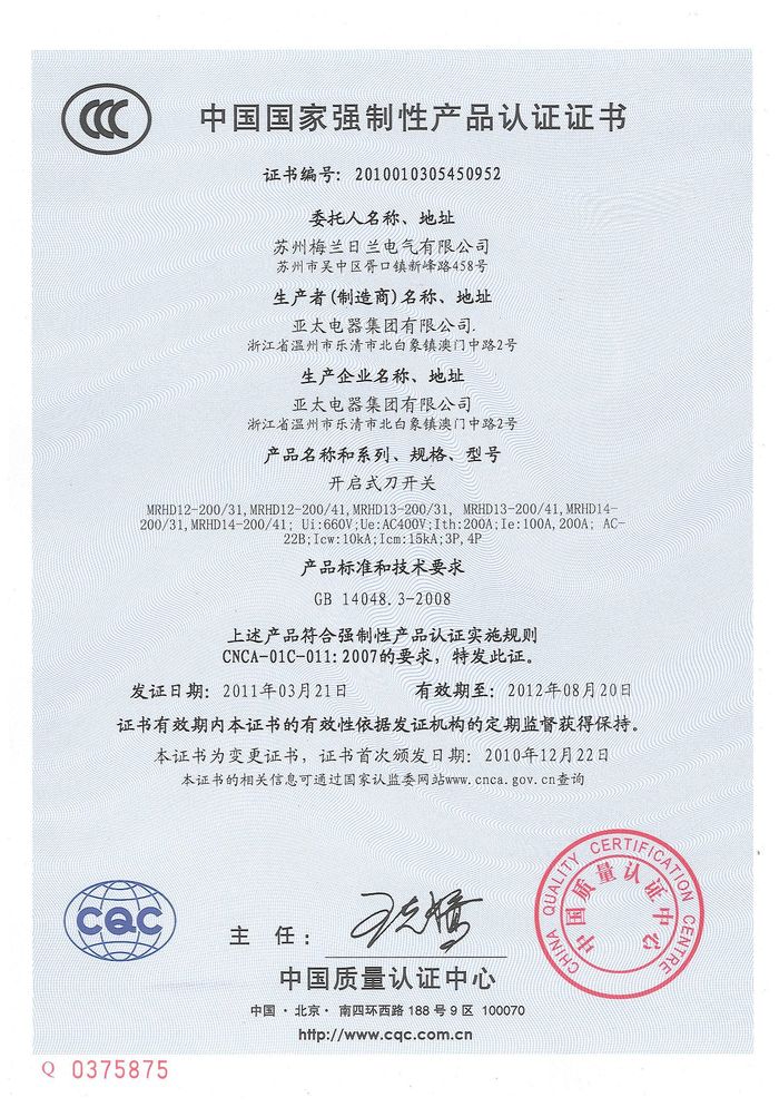 MRHD刀開關資質(zhì)證書