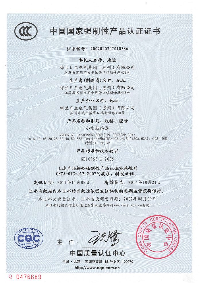 MRB65-63小型斷路器資質(zhì)證書