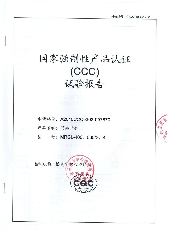 MRGL-400隔離開關(guān)資質(zhì)證書